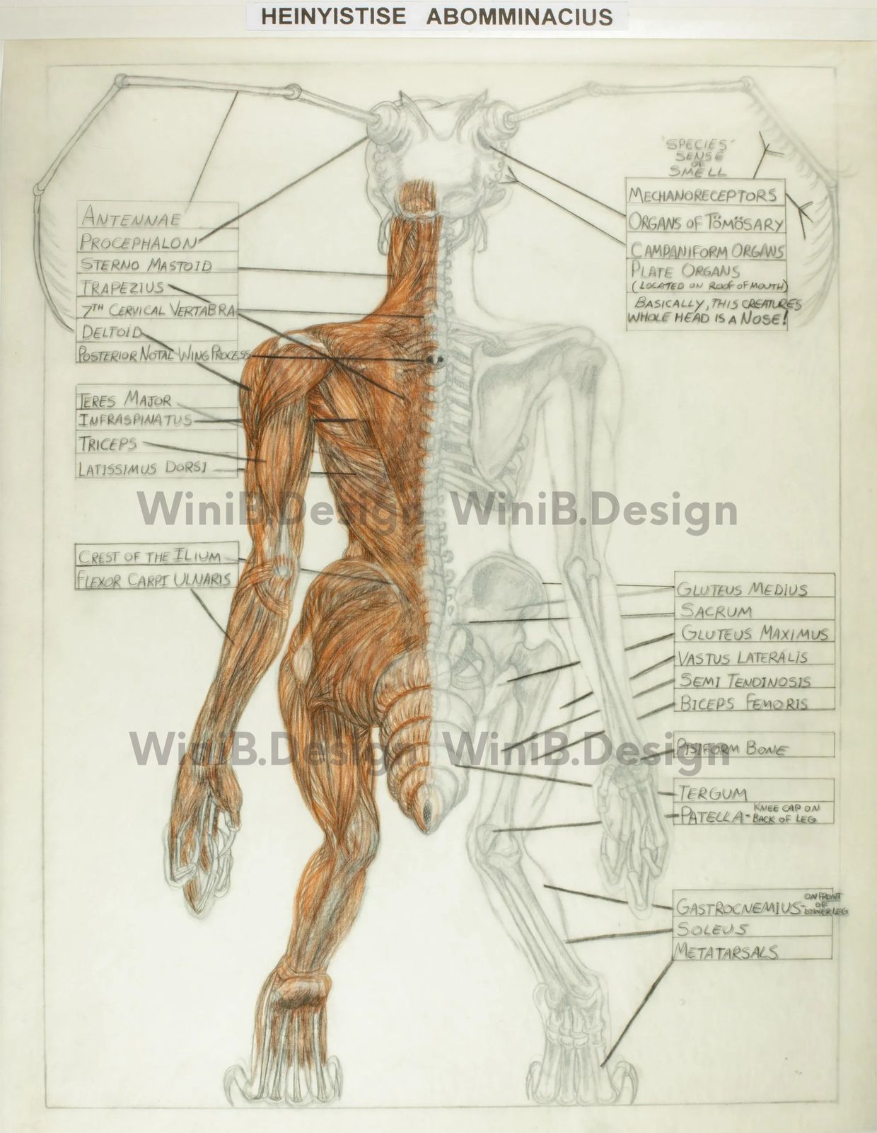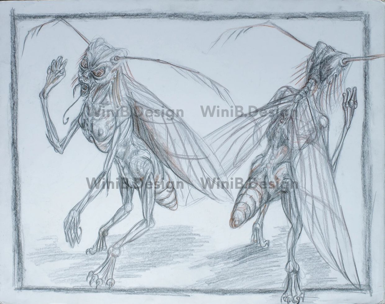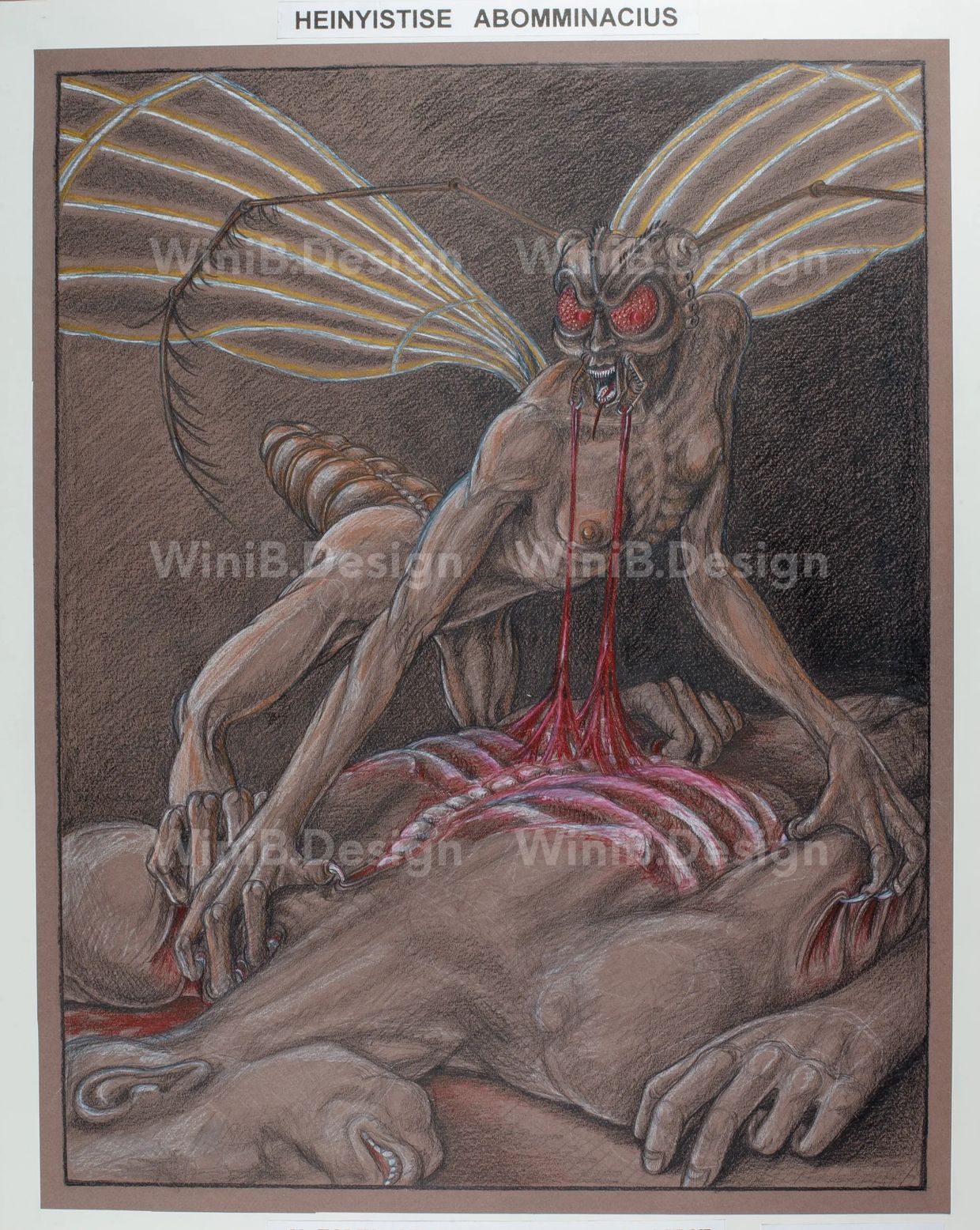 It can eat decaying matter, drink blood or body fluids, or feed on living tissue, smelling prey from up to 25 miles away, making it a formidable hunter. Growing up to three and a half feet in height, its bones are chitinous like a bird’s, which lowers its overall weight enabling it to fly. It only has two functions; the need to feed, which is shown, and the need to reproduce.