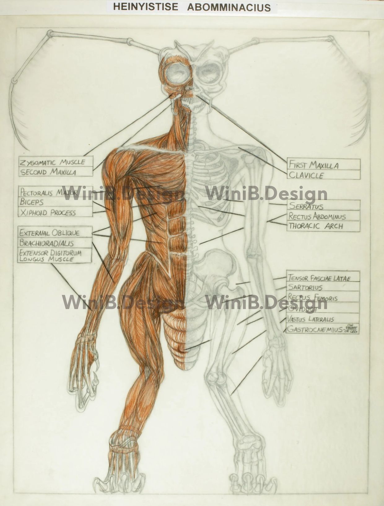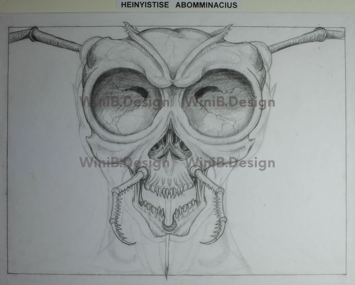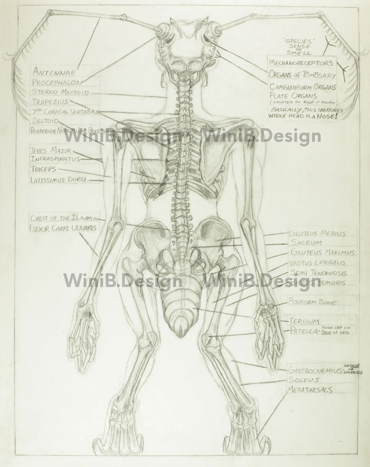 It can eat decaying matter, drink blood or body fluids, or feed on living tissue, smelling prey from up to 25 miles away, making it a formidable hunter. Growing up to three and a half feet in height, its bones are chitinous like a bird’s, which lowers its overall weight enabling it to fly. It only has two functions; the need to feed, which is shown, and the need to reproduce.