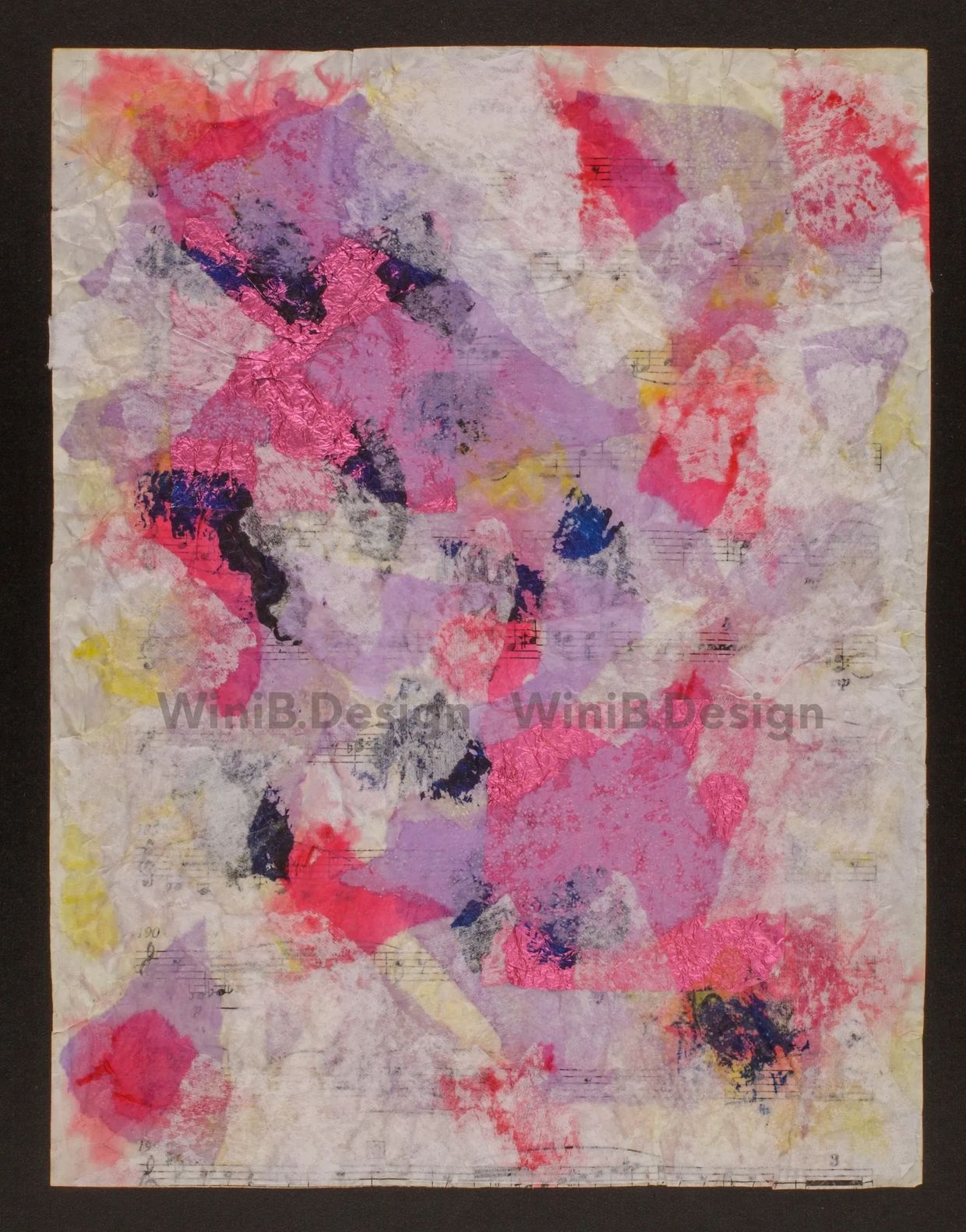 Tissue paper, acrylic, and See’s candy wrappers on a sheet of music. Approx. 8” X 11”