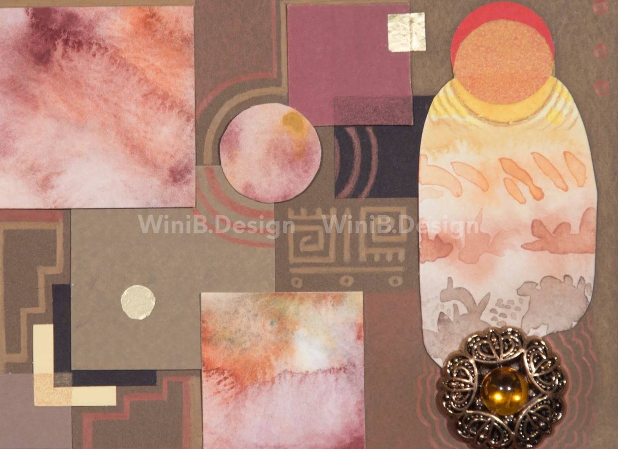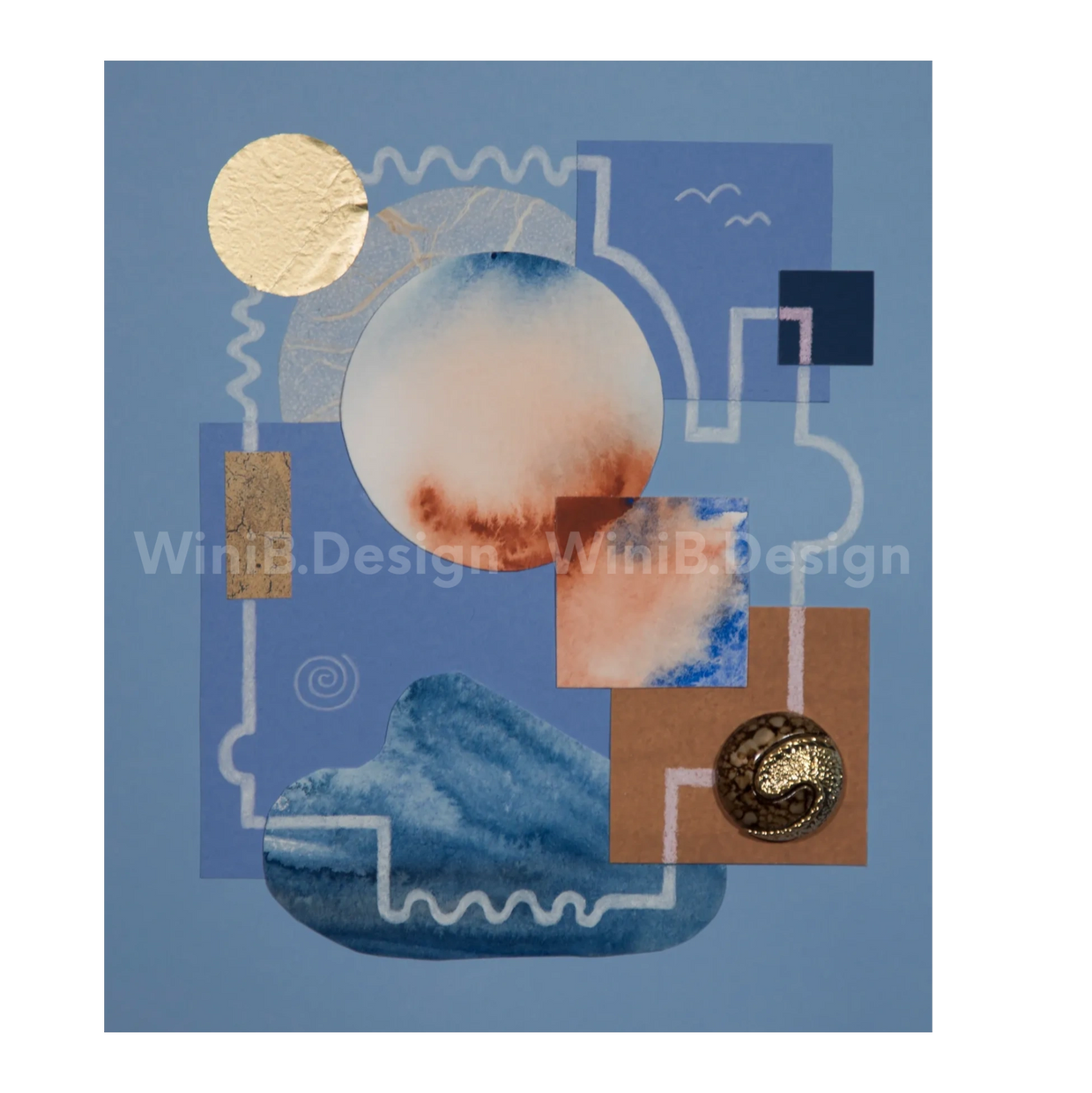 Watercolor swatches, tissue, gold foil, colored paper, plastic button, and colored graphite on card stock.
